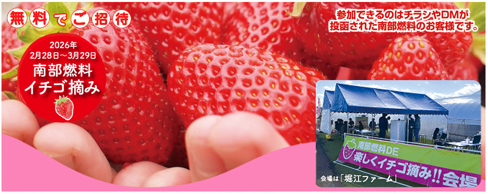 南部燃料で -無料でご招待- イチゴ摘み/ガス会員様にさらに特典あり!15円値引きも